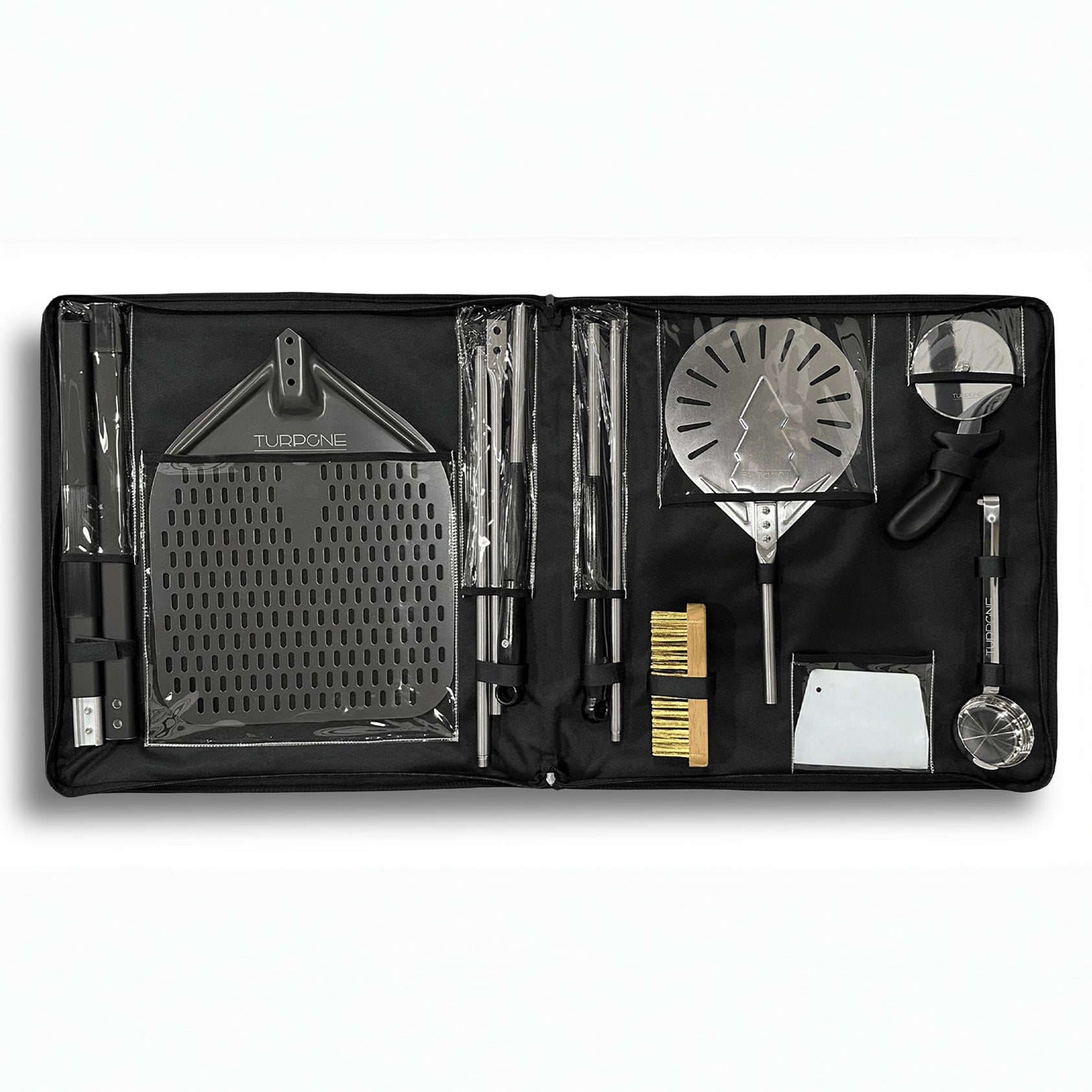 • Complete six piece pizza tool kit with perforated peel, turning peel, sauce spoon, rolling cutter, dough scraper, and stone brush