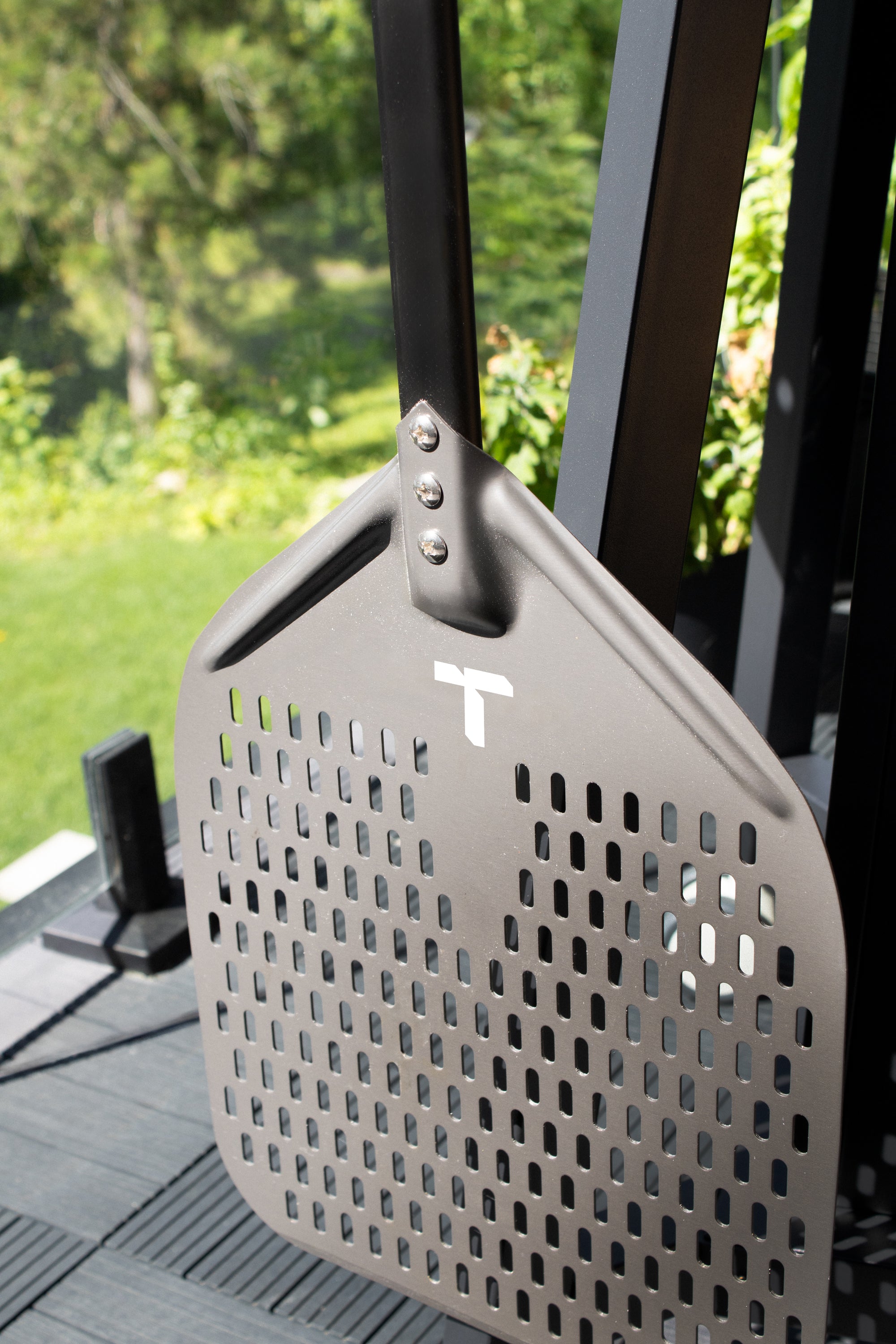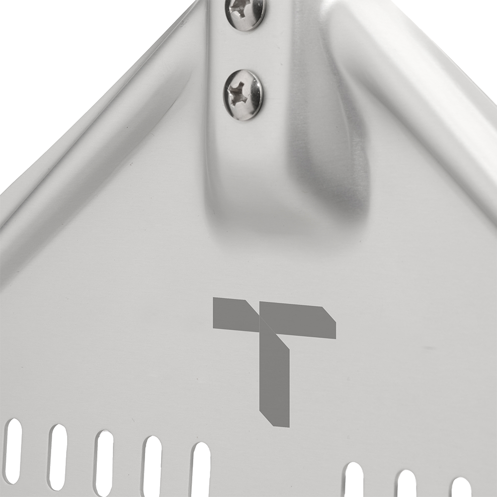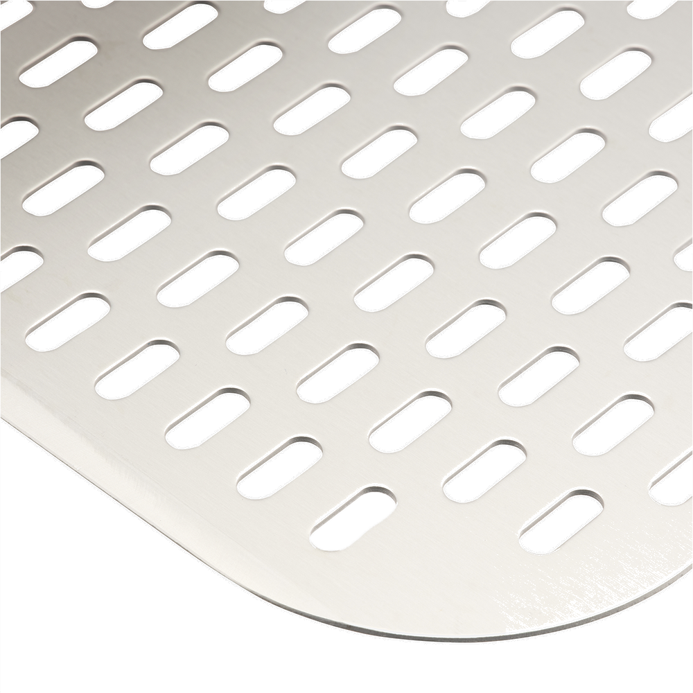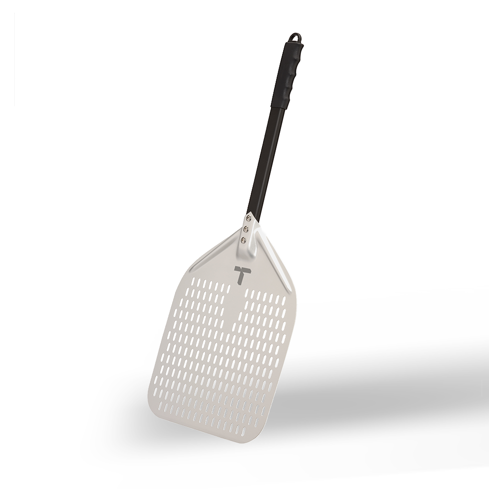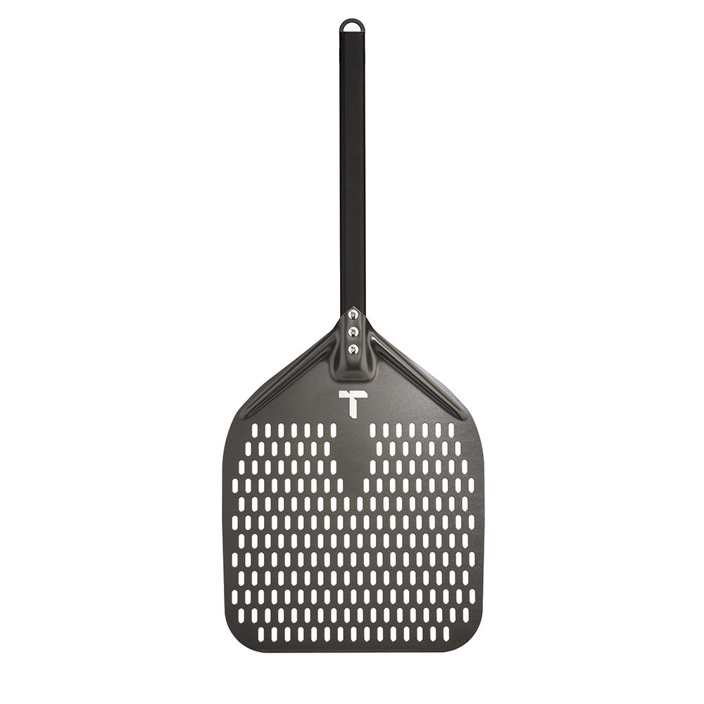 The Turpone Pizza Peel is a professional-grade, perforated peel designed for the easy placement of the pizza dough into your Turpone Pizza Oven. This aluminum pizza peel has an anodized finish. Its tapered front edge is designed to allow the peel to slip effortlessly under the dough while the perforations avoid excess flour to slide onto the stone. The Turpone Pizza Peel has an integrated loop for easy hanging when not in use.