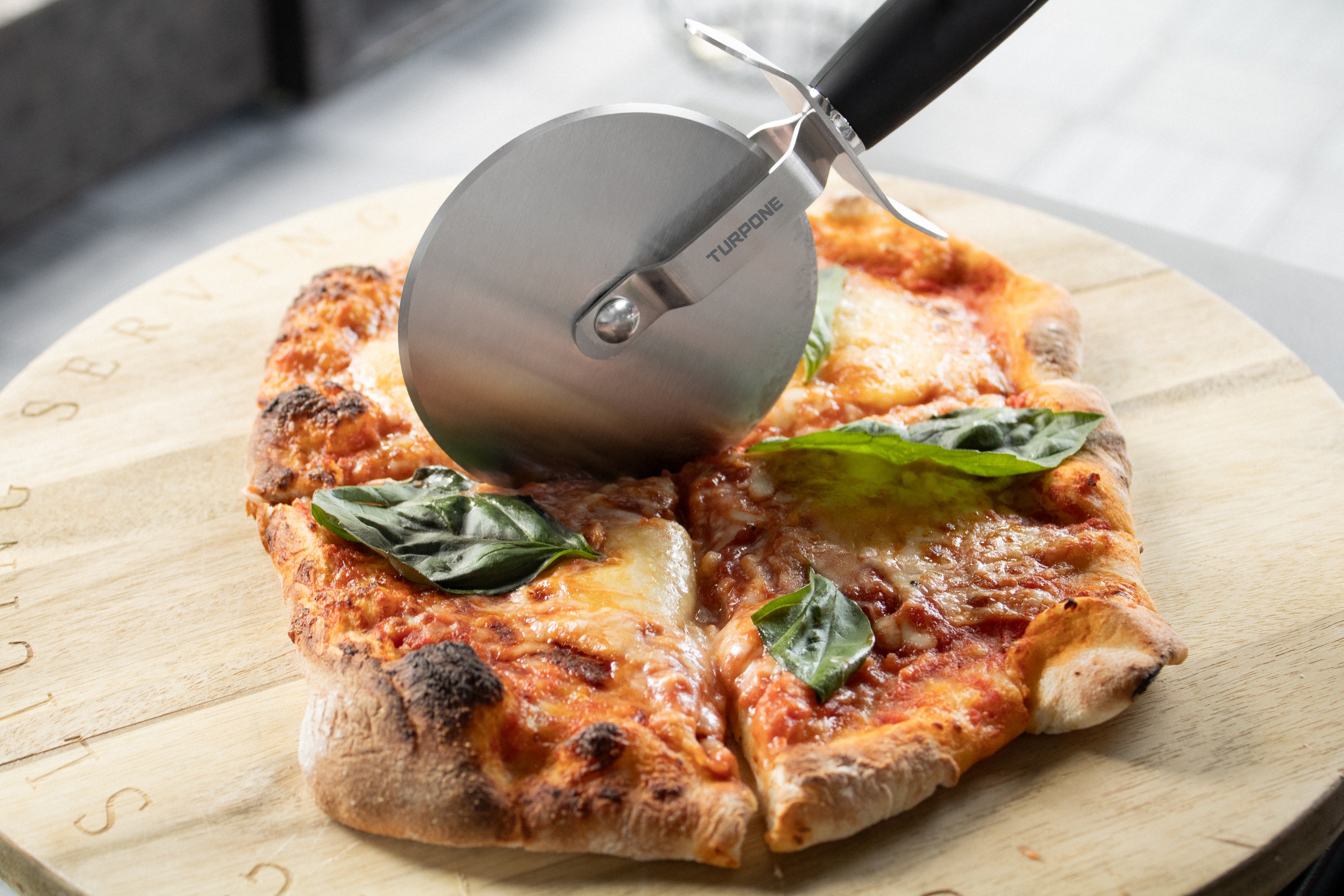 Slice pizza like a pro with the Turpone Rolling Pizza Cutter, crafted with a stainless steel blade for streamline cutting and a soft touch handle. For the perfect slice, push the wheel down firmly on the crust and roll across the pizza in one swift movement.